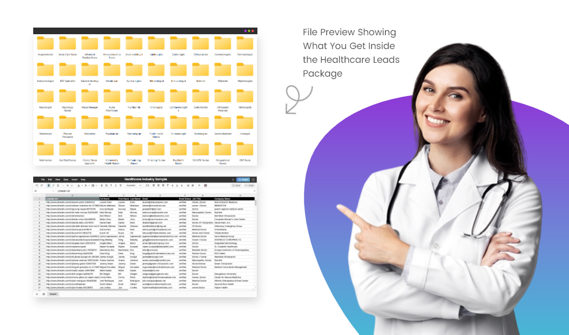 Talk to administrators, decision-makers, and vetted medical professionals at clinics, hospitals, and other healthcare facilities. To help you connect faster, generate high-quality leads, and effectively grow your healthcare business, MedLeadPro’s healthcare email database offers comprehensive contact details, including direct emails, phone numbers, and LinkedIn profiles.