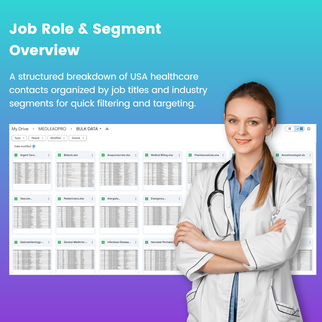 We promise that every record is accurate and organized to meet your business needs. From phone numbers and email addresses to organization details and LinkedIn profiles, MedLeadPro makes it easy for you to connect, interact, and create mutually beneficial partnerships in the healthcare sector.